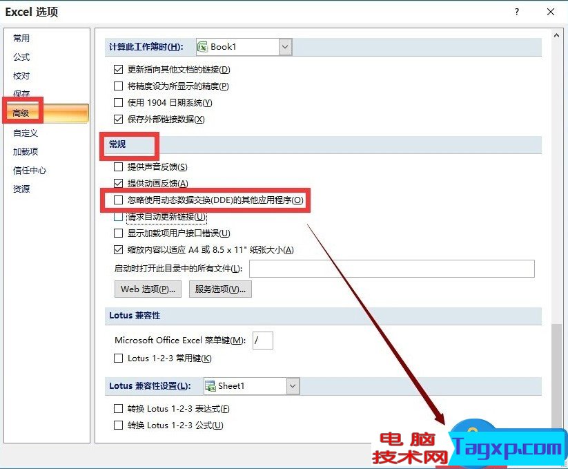 6、在高级选项右侧列表中下拉,找到常规,把“忽略使用动态数据交换(DDE)的其它应用程序”前面的勾去掉,然后点击“确定”按钮,重新启动Excel程序即可!如下图所示: