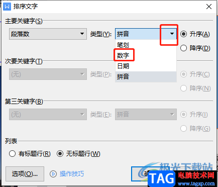 3.这时可以看到打开的排序文字窗口,用户需要点击类型选项旁的下拉箭头,在弹出来的选项卡中选择数字选项