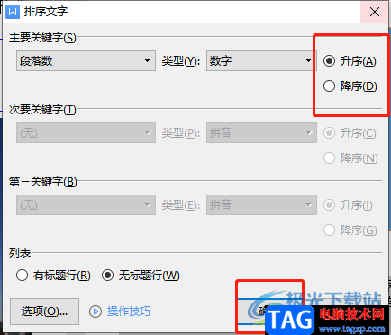 4.随后用户还需选择排序的升序或是降序选项,选择好后直接按下窗口右下角的确定按钮即可
