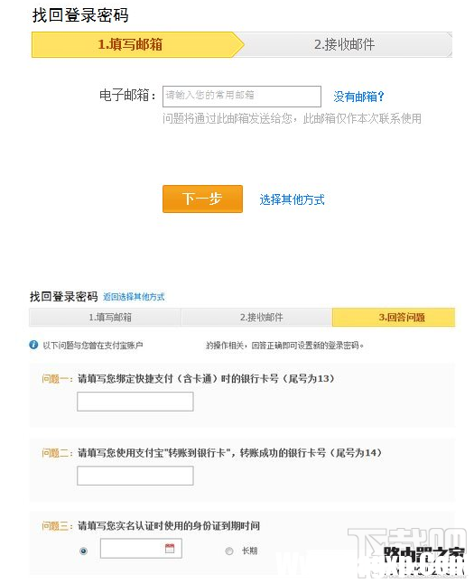 接下来会提示你找回密码的途径,手机找回最为简单呐,无论选择哪种方法,根据提示填写,然后更改你的密码后重新登陆就可以了,登陆限制就会被解除的哦~如果遇到什么不可预见的问题,及时联系支付宝客服即可。邮箱验证要回答问题哦