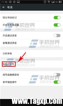 2)进入设置页后点击【电话】,你就可以看到各种功能,接着点击【智能IP拨号】。(如下图)