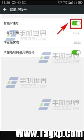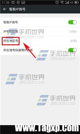 3)进入智能IP拨号后点击智能IP拨号右边【开关】按钮,打开后点击【所在地区号】。