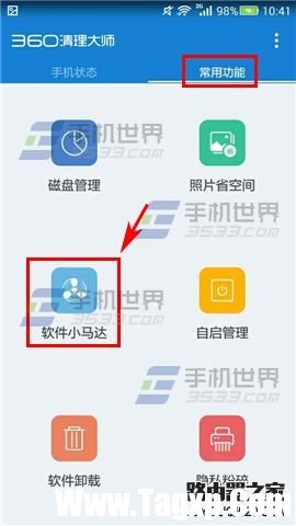 1)打开360清理大师,在【常用功能】栏点击【软件小马达】,然后选择一个类型,点击右侧的【+】;(如下图)