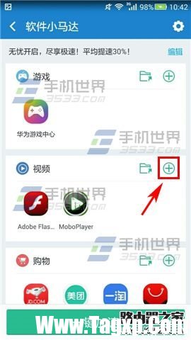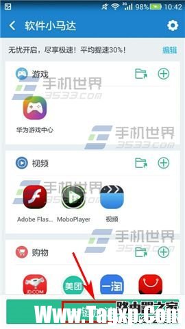 2)找到应用,点击【添加】,回到【软件小马达】页面,点击【一键加速】;(如下图)