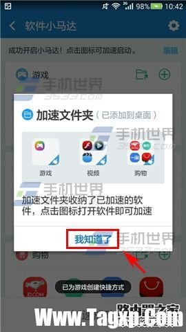 3)此时应用会在桌面添加加速文件夹,点击【我知道了】,然后回到桌面,从加速文件夹里面进入应用,就可以实现加速了。(如下图)