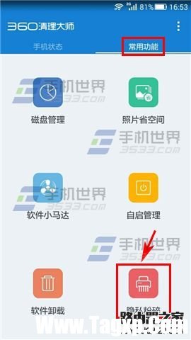1)打开360清理大师,在【常用功能】栏点击【隐私粉碎】;(如下图)