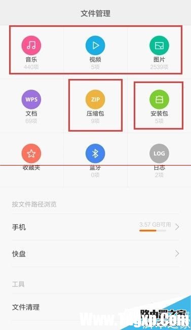 2、进入到“文件管理”后,我给大家框起来的这些里面有一部分或者所有文件都是可以删除的(在你不需要的情况下)。比如这个压缩包中可能有你之前更新系统的文件包,这些文件往往占用了300M左右的存储。