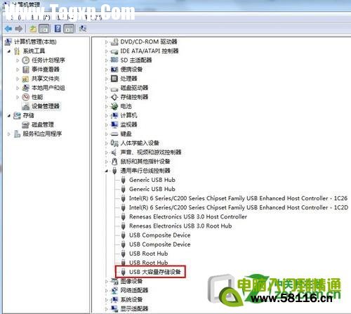 U盘如果在计算机里面找不到盘符就应该去设备管理器查看设备状态,所有的即插即用的USB设备都会显示在通用串行总线控制器里面,如果U盘识别到了,无论是能否正常使用状态都会在此显示,如下图的和问题补充里面的图片对比就会看到当U盘正确识别的情况下会显示USB 大容量存储设备。