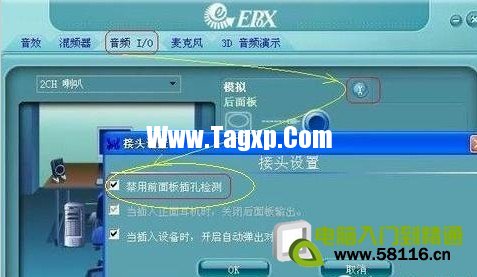 如上图步骤,首先切换到"音频I/O"选项,然后在"模拟后面板"右侧有一个设置工具,点击进入设置,之后在弹出的面板中将"禁用前面板检测"前面的勾打上即可,之后选择OK确认即可,如下图: