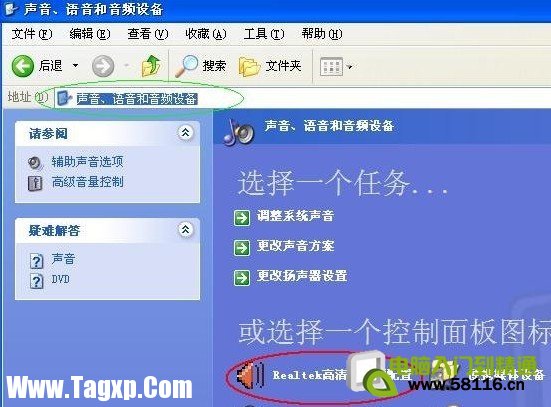 进入电脑桌面,左下角的开始--控制面板-选择"声音、语音和音频设备" -- ;Realtek高清晰音频配置”如下图: