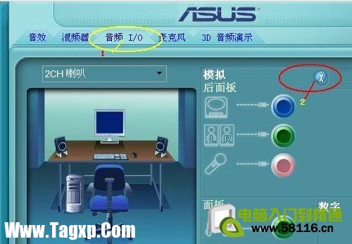 进入"Realtek高清晰音频配置"界面, 选择切换到顶部的"音频I/O"选项卡,并点击"模拟面板"的设置图标,如下图: