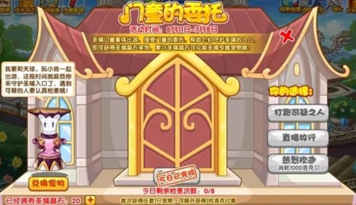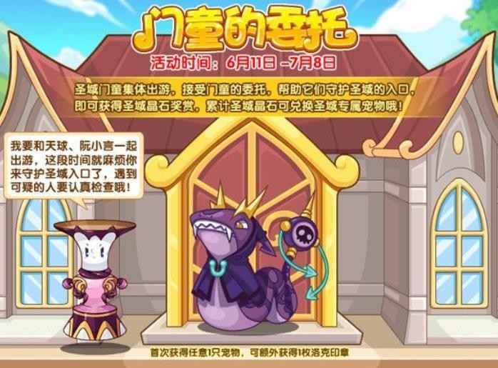 圣域门童集体出游,接受门童的委托,帮助它们守护圣域的入口,即可获得圣域晶石奖赏,累计圣域晶石可兑换圣域专属宠物哦!