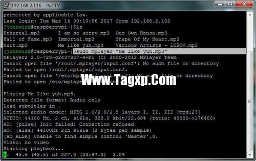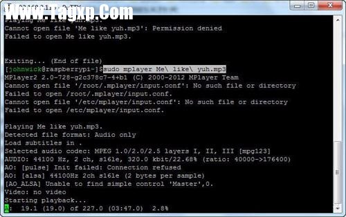[johnwick@raspberrypi~]$sudo mplayer Me like yuh.mp3