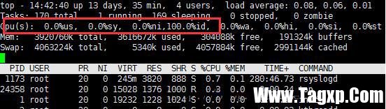 图中红框里表是cpu使用情况,最右侧的%id表示剩余,若很低,则表示cpu被吃完了,在top界面按shift+p对进程使用cpu排序,能看到哪些进程占用cpu较多。