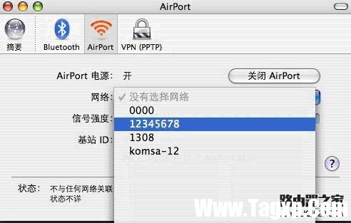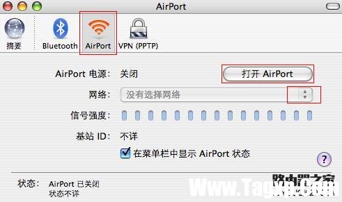 STEP2:选择“AirPort”,进入WiFi设置页面。点击“打开AirPort”开启无线开关,搜索无线信号,如下图所示。