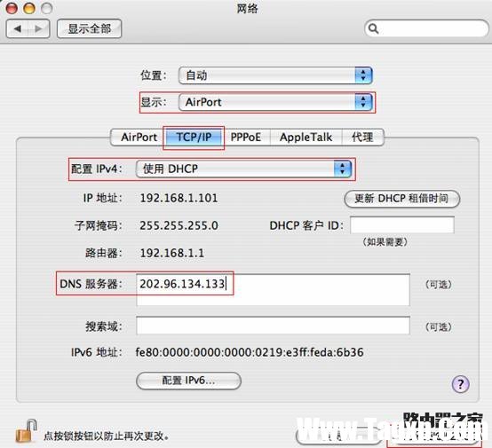 选择桌面图标“System Preferences”。在弹出的页面中选择“网络”。弹出网络连接设置页面,如下图所示,“位置”选择“自动”,“显示”选择“AirPort”,选择“TCP/IP”,即可设置无线网络参数(推荐使用DHCP)。