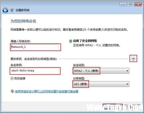 4. 此页面可以设置MW150R的无线网络名称(即SSID)、无线网络的安全级别以及安全密钥。默认已经自动生成了无线网络名称并选择WPA2-个人 AES的安全级别和相应的安全密钥。当然,您也可以手动进行修改。点击“下一步”,约10s左右的时间,提示设置成功。