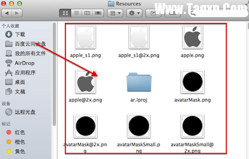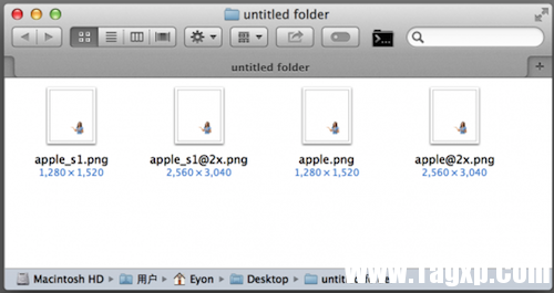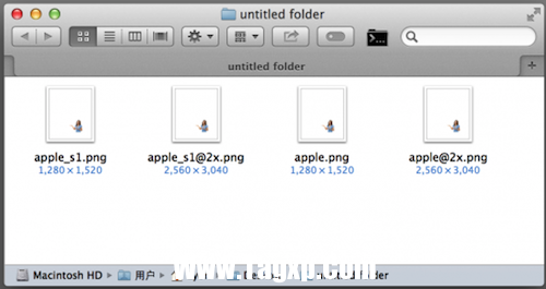 第二步:将得到的两张图片分别复制一份,得到4张图片。将两张小分辨率图片分别命名为 apple.png 和 apple_s1.png,将两张大分辨率图片分别命名为 apple@2x.png 和 apple_s1@2x.png。