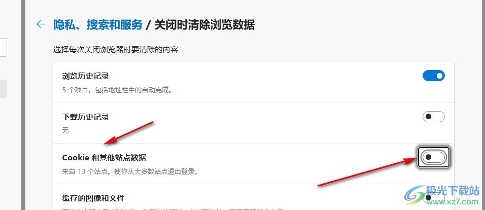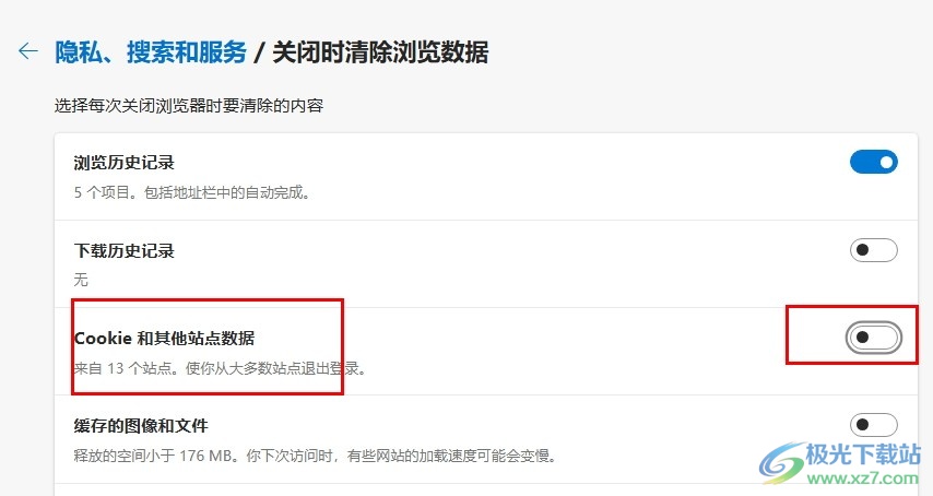 5、第五步,最后我们在“关闭时清除浏览数据”页面中点击关闭“Cookie 和其他站点数据”的开关按钮即可
