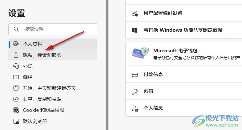 3、第三步,打开“设置”选项之后,我们再在设置页面中找到“隐私、搜索和服务”选项,点击打开该选项