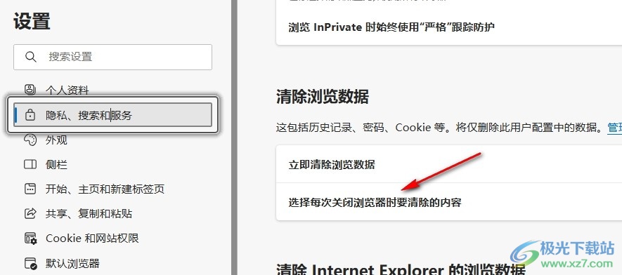 4、第四步,进入“隐私、搜索和服务”页面之后,我们在该页面中找到“选择每次关闭浏览器时要清除的内容”选项,打开该选项