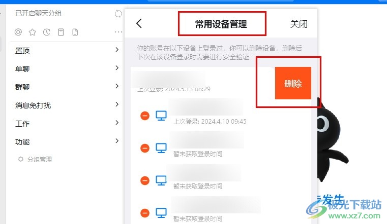 很多小伙伴在使用钉钉软件的过程中经常会需要在各种软件上进行设备登录,有的小伙伴在使用钉钉时想要将不再需要的登录设备进行删除,避免这些设备上被人登录自己的账号,但又不知道该怎么进行设置。其实我们只需要在钉钉页面中打开自己的头像,然后在菜单列表中点击“已在手机/平板上同时登录”选项,接着在弹框中打开“常用设备管理”选项,最后在新页面中点击编辑选项,再点击删除图标即可。有的小伙伴可能不清楚具体的操作方法,接下来小编就来和大家分享一下钉钉删除常用登录设备禁止其它设备登录的方法。