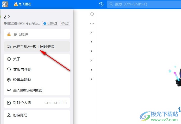 2、第二步,打开头像之后,我们在菜单弹框中找到“已在手机/平板上同时登录”选项,点击打开该选项