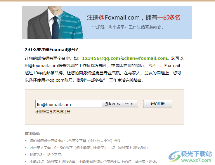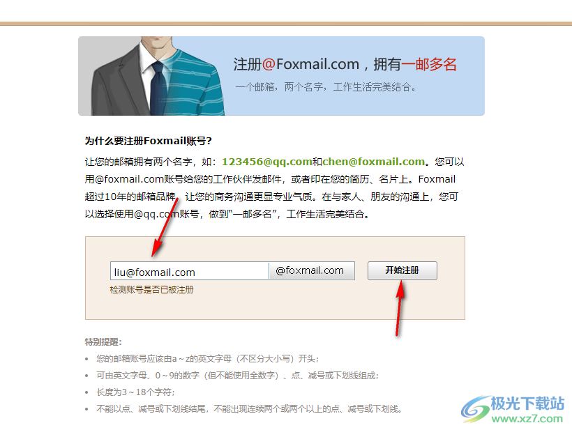 5.随后即可进入到注册页面上,我们可以根据提示进行注册,在输入框中输入自己的英文姓氏,后面添加Foxmail.com就好了,之后点击立即注册即可。