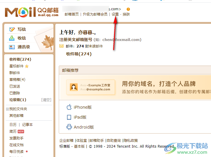 2.这时候,我们在打开的qq邮箱的页面中,将页面上方的【设置】选项进行点击一下。