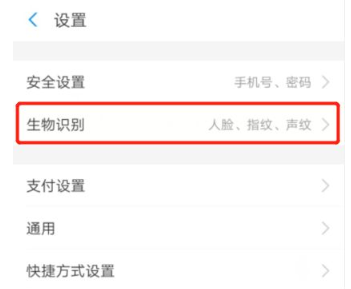2、点击设置,进入设置界面,找到“生物识别”,点击生物识别进入生物识别界面。