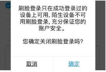 5、点击关闭刷脸登录,弹出关闭提示,点击确定,成功关闭支付宝刷脸登录。