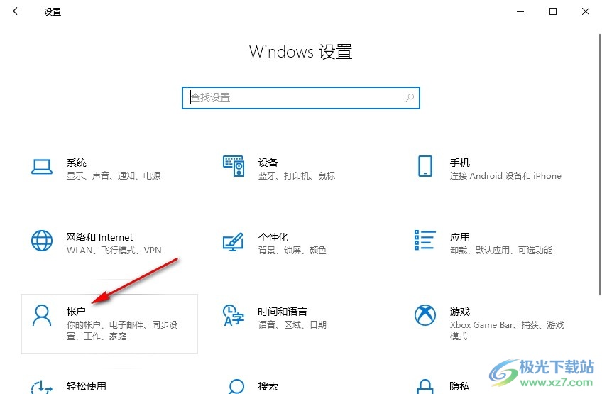 2、第二步,进入设置页面之后,我们在该页面中点击打开“账户”选项