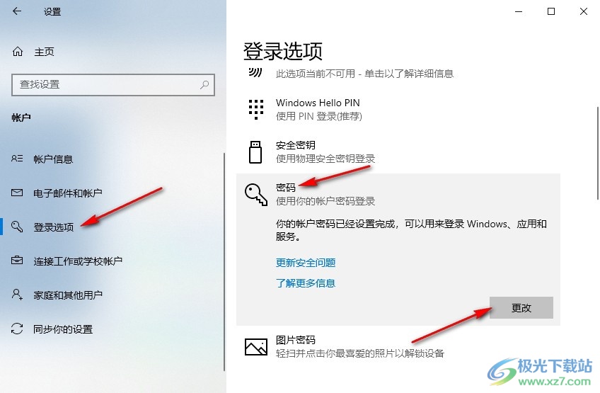 3、第三步,进入账户页面之后,我们在登录选项的右侧页面中先打开密码选项,再点击更改选项